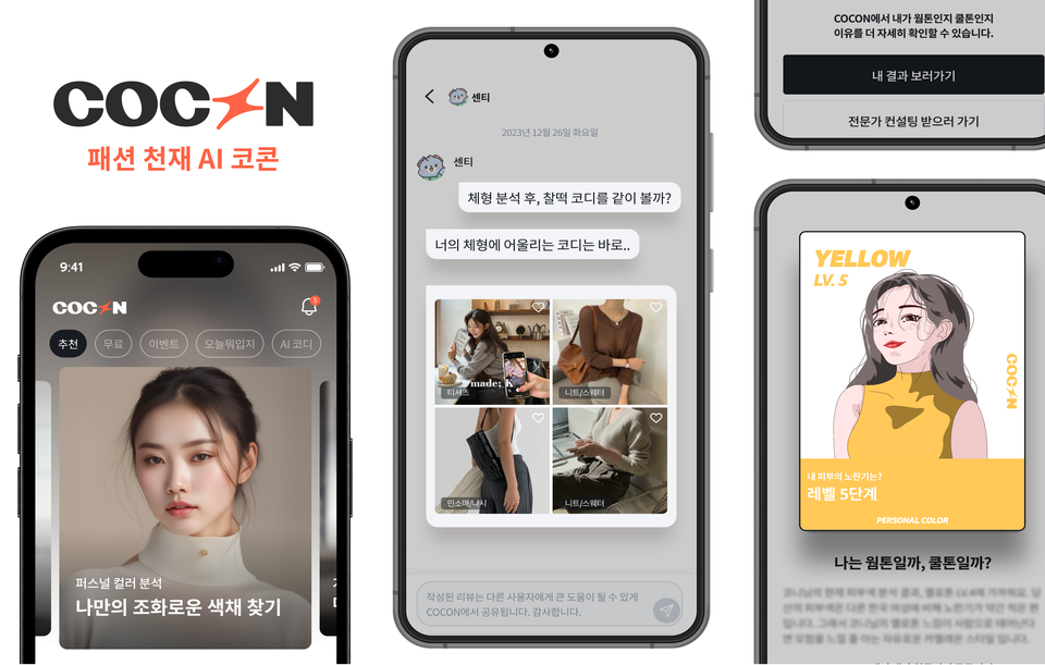 코콘(COCON)은 인공지능(AI)을 기반으로 한 패션 애플리케이션으로, 사용자의 퍼스널 컬러와 체형을 분석하여 맞춤형 패션 아이템을 추천해주는 서비스입니다. 사용자가 얼굴 사진을 업로드하면 AI가 피부 톤, 명도, 채도 등을 분석하여 최적의 컬러를 찾아주고, 이를 바탕으로 사용자에게 가장 잘 어울리는 옷을 추천합니다. 코콘 앱은 퍼스널 컬러 분석 외에도 체형 분석과 이미지 분석 기능을 제공하여 사용자 맞춤형 스타일링을 제안하며, 앱 내에서 추천받은 패션 아이템을 바로 구매할 수 있어 편리합니다.