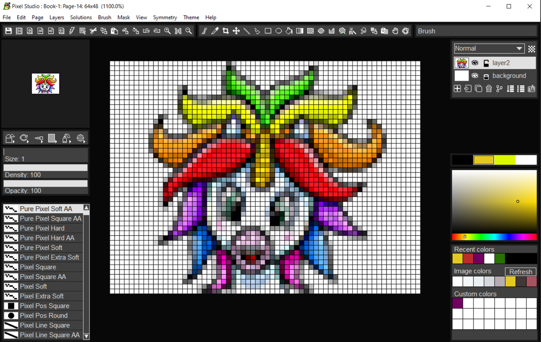 Pixel Studio는 도형 도구, 그라디언트 도구, 다양한 브러쉬 등을 제공하여 사용자들이 원하는 대로 창작할 수 있게 해줍니다. 특히, 대칭 그리기 기능을 통해 완벽한 대칭 아트를 쉽게 만들 수 있습니다. 또한, 고급 색상 선택기와 커스터마이징 가능한 툴바 등을 통해 더욱 편리한 작업 환경을 제공합니다.